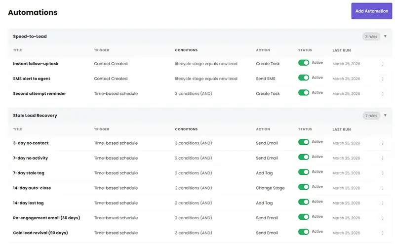 - 8 action types including SMS. Send emails, send SMS via Twilio, change lifecycle stage, create tasks, assign agents, add tags, run property matching, send weekly digests — all from a single automation rule.