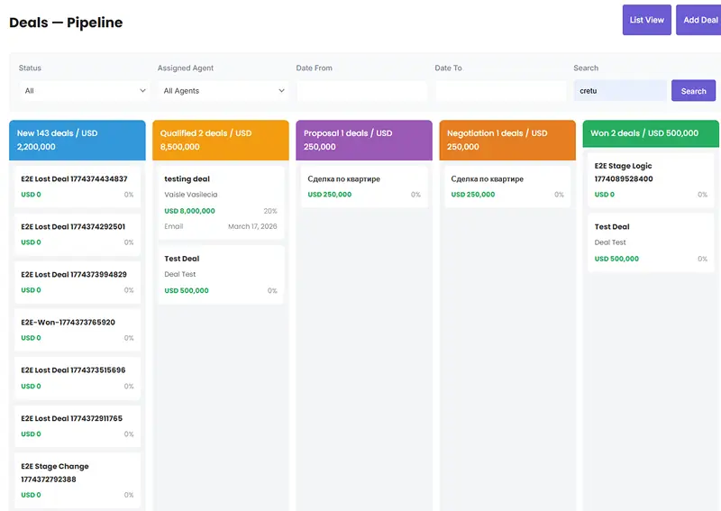 Deals live in a kanban board. Stages are configurable. You drag a deal card from one column to the next — the stage updates, the `stage_changed_at` timestamp records exactly when, and any automation rules watching for that stage change fire immediately.
