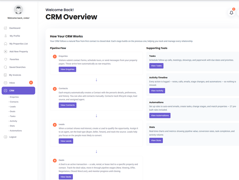 The CRM starts with a clear overview dashboard and a guided flow that helps users understand how everything connects. Enquiries move into Contacts, Contacts can become Leads, and Leads can move into Deals. Around that flow, users also get access to Tasks, Activity Timeline, Statistics, and Automations.