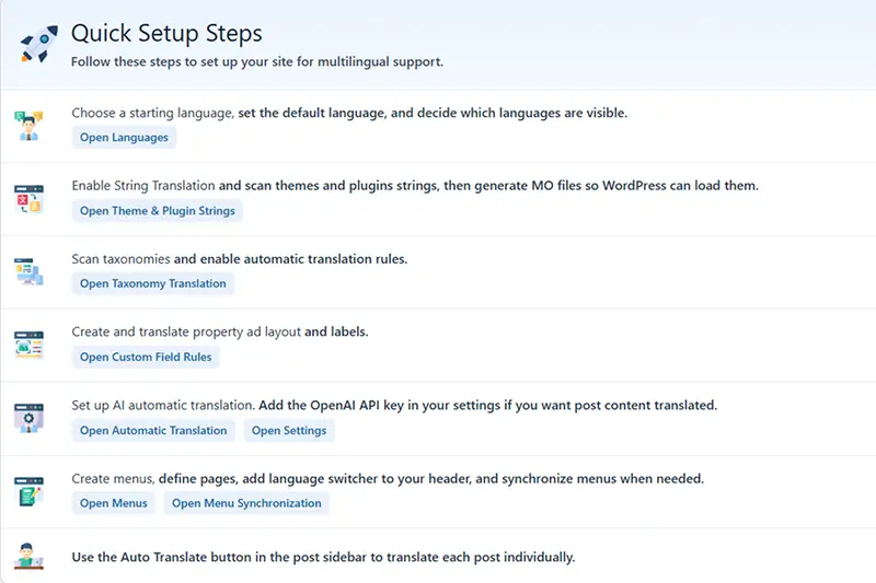 WPEstate Translate includes per-language post clones, language-aware permalinks, translated taxonomies with proper slug rewrites, menu language assignment with a sync tool, an Elementor translation workflow, a string translation screen that compiles custom MO files, per-language SEO tags with hreflang support, and AI auto-translationvia OpenAI. Full details are available in the dedicated WPEstate Translate release post.